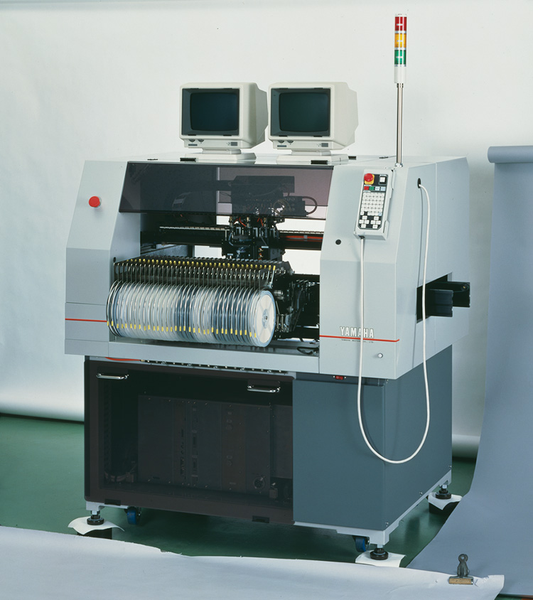 ロボット・コントローラーとは、ロボットに動きを命令する制御装置。ヤマハモーターエンジニアリングは、創業間もない1981年からヤマハ発動機(株)の産業用ロボット・コントローラー開発に携わってきた。当初は単軸・2軸用のコントローラーだったが、実績が認められ、1986年からは3軸以上(多軸)のコントローラー開発の支援も開始。また、この頃から、産業用ロボットを応用したサーフェスマウンター※の開発にも携わるようになる。※サーフェスマウンターとはプリント基板に電子部品を自動装着するための装置であり、表面実装機・チップマウンターなどとも呼ばれる。