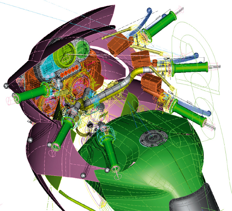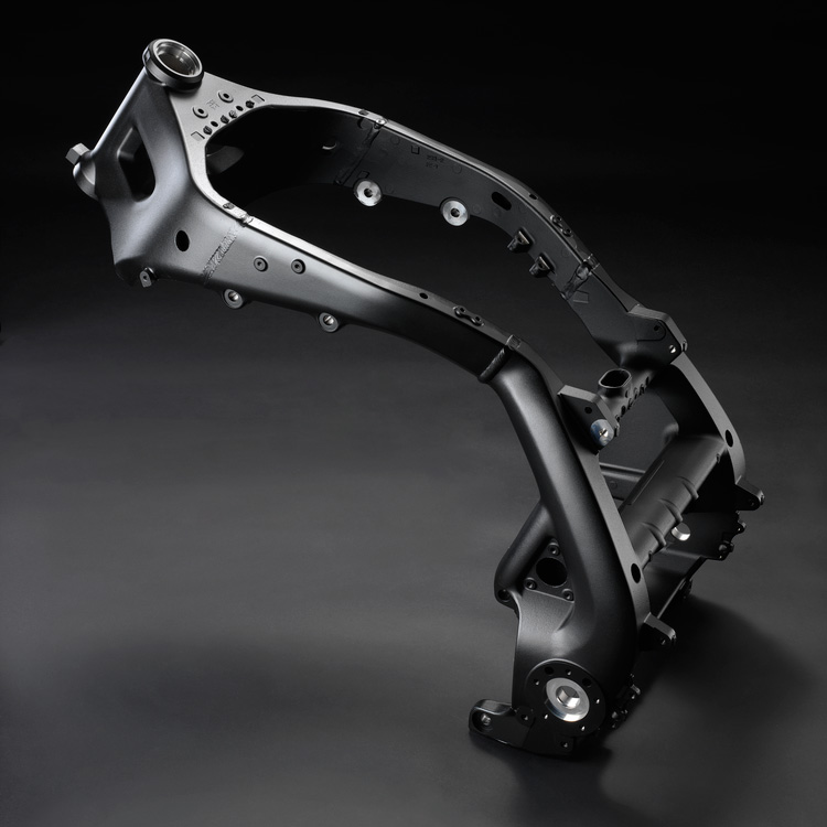 当時のスポーツ系のモーターサイクルでは、商品の競争力向上のためにフレーム構造の一体化が要求されており、従来は別々に製造された部品を溶接等で組み上げ、車体で結合していた。しかしこの方法は製造工数が多く、重量の増加やコストアップに繋がる。そこで、これらのパーツを一体で成型する鋳造方案が開発された。この鋳造方案を実現するためには、デザイン性の高い意匠部品を連続して製造できる自動化システムの開発が必須だった。そこで開発したのが、当社の持つロボット等の技術を駆使した、アルミフレーム鋳造システムである。加工治具の削減を図り、ロボットによる仕上システムを構築するなど、多種少量生産に対応するシステムとした。