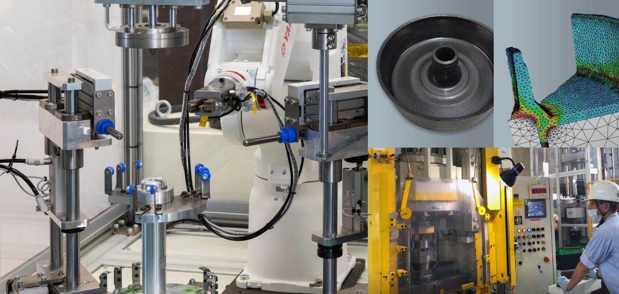 長年にわたる塑性加工技術と金型技術の蓄積が生み出した新しい「板鍛造工法」です。板金プレス成形の引張りを主体とした成形方法と、鍛造の圧縮成形を主体とした成形方法を組み合わせ、さらに精密なせん断加工を取り入れることで、軽量・高剛性など高い付加価値を生み出す複合塑性工法に進化させています。低コストと高い生産性を両立しつつ、20%のCO2削減効果が見込まれる技術です。