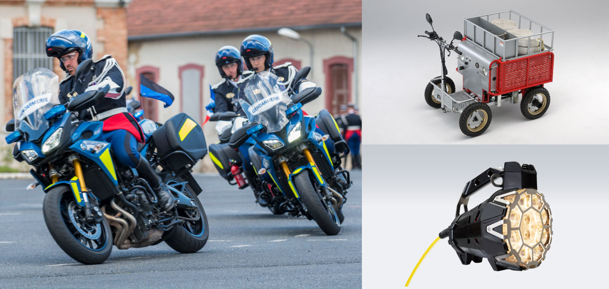 (左)LED可搬式投光器/(右上)災害救援活動二輪車/(右下)電動アシストホースカー